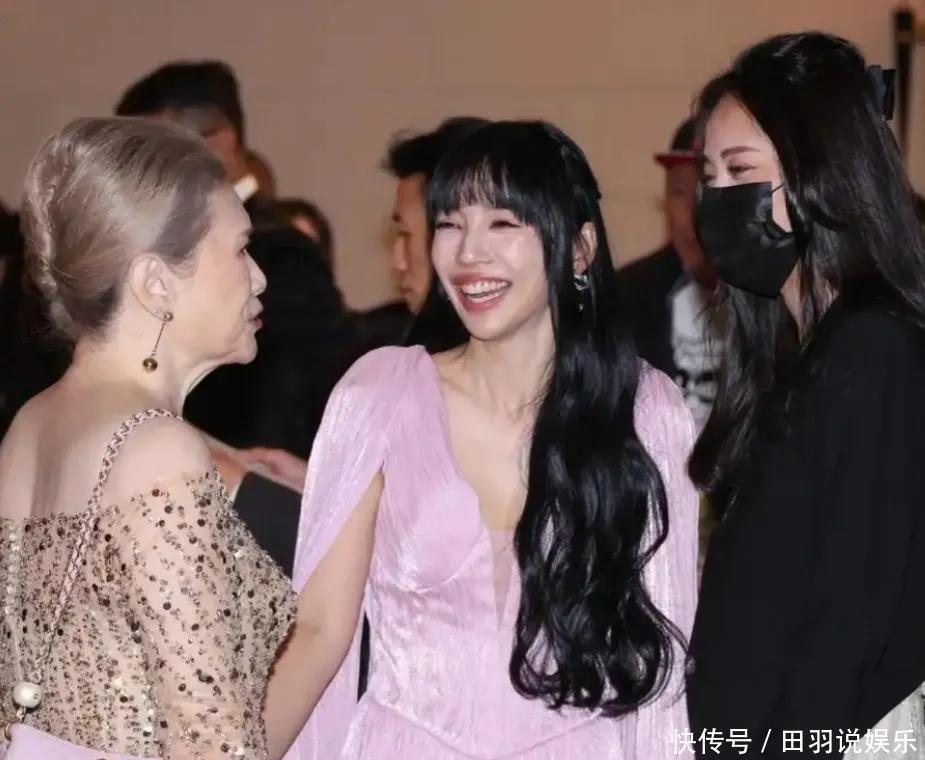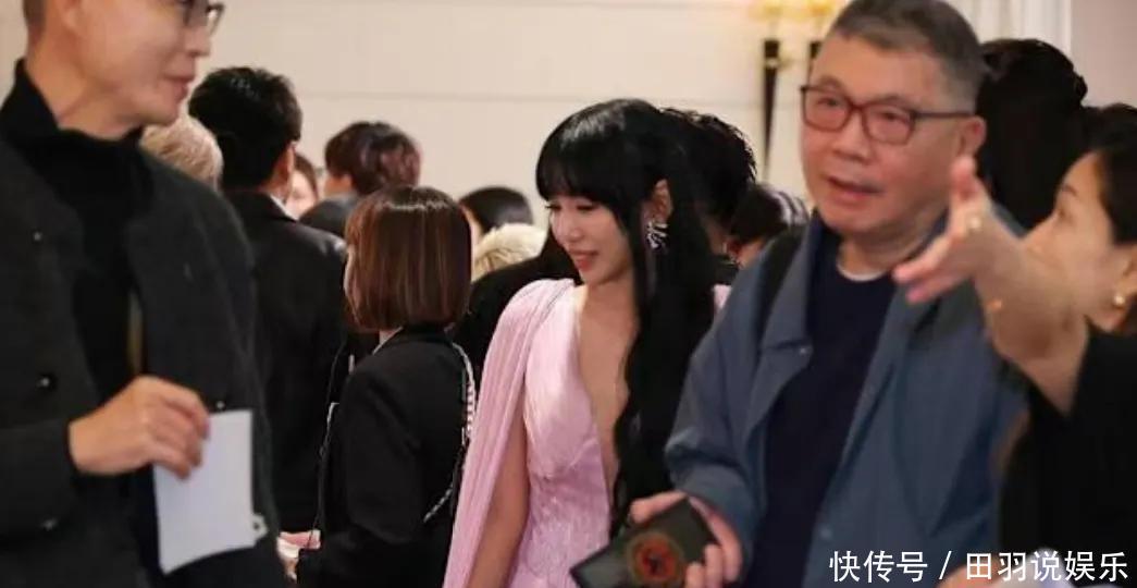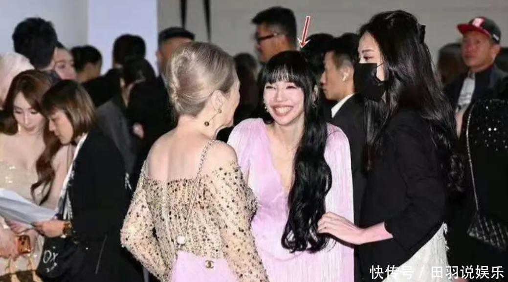 浓妆、大波浪、夸张的假睫毛,还有那标志性的齐刘海。最让人惊讶的是她的笑容,从头到尾,她的嘴角就没下来过。和其他宾客聊天时,她突然咧嘴大笑,露出整整12颗牙齿,嘴巴大到让人想起姚晨。